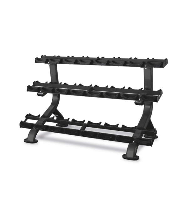 L875BB Range haltères (12 paires) de marque BH Fitness. Gamme professionnelle. Idéal Collectivités, Sapeurs-Pompiers et Salles de remise en forme. Utilisation intensive 6 à 8 heures par jour. Permet de ranger sur 3 niveaux jusqu’à 12 paires d’haltères bloqués ou hexagonaux. Structure du châssis ultra qualitative en acier de qualité ST-37/40 de 4 millimètres d’épaisseur (tubes de section arrondis). Peintures multicouches traitée anticorrosion qui garantit la durée de vie de cette machine. Par-dessus est appliquée une couche de poudre époxy et finition de laque ou vernis lui donnant un design moderne.