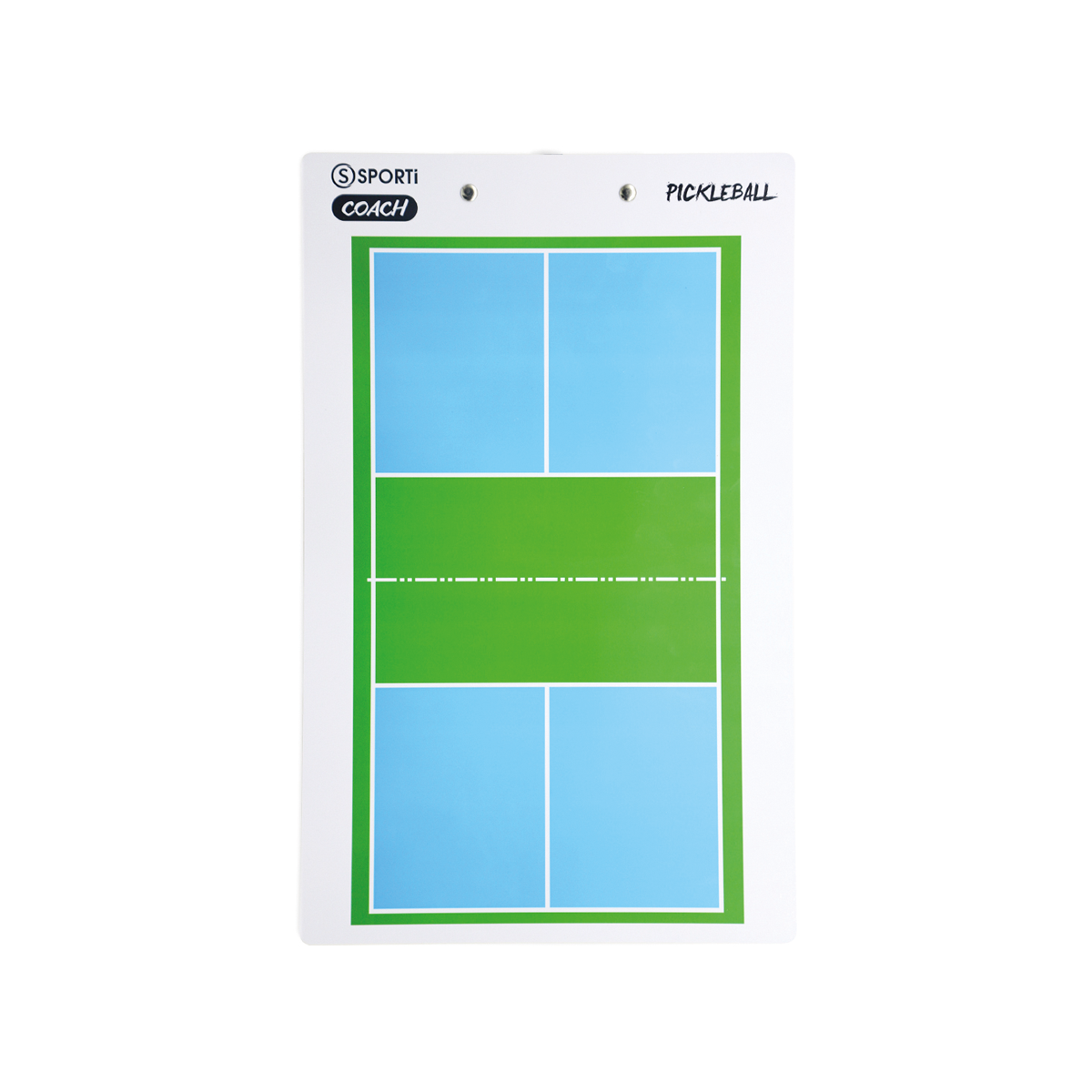 Planche effaçable rigide en PVC avec pince métallique. Une face avec terrain de BADMINTON et une face avec terrain de PICKLEBALL. Livré avec un marqueur. Longueur : 36 cm, largeur : 22,5 cm.